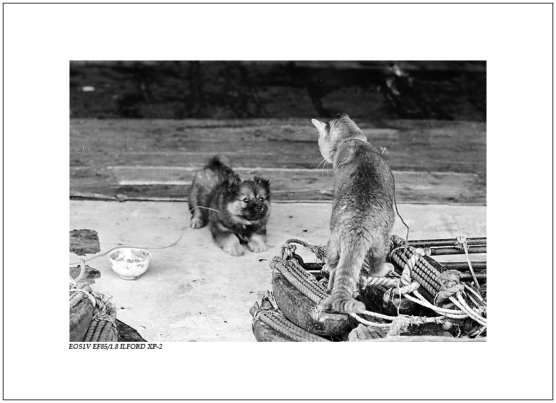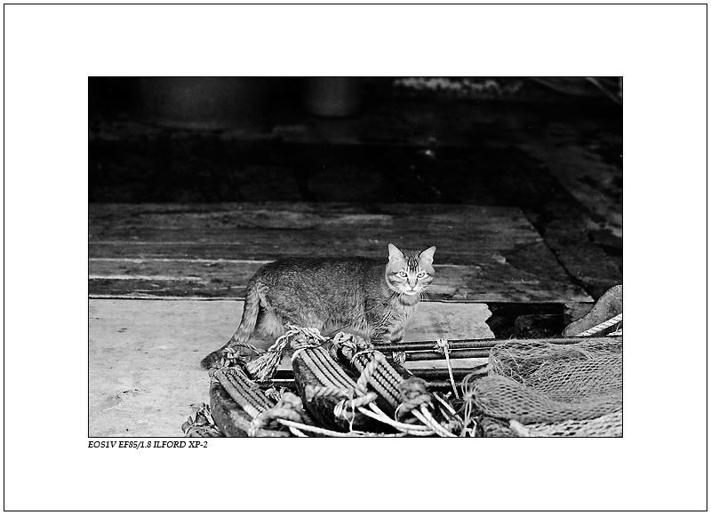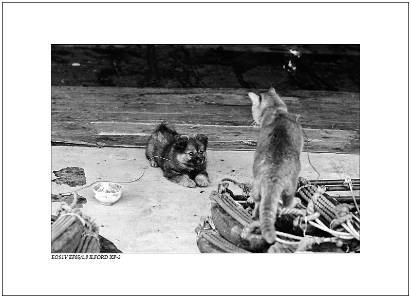 看来这里不能说猫的坏话,"忒不地道"只是玩笑,渔船上文化生活贫乏,猫猫狗狗逗乐而已,相处看起来还是很融洽的(估计是因为狗爱啃骨头而不是鱼) 不但渔船上的猫,还有村里的猫,都没有城里的猫那么丰富多彩的文化生活. 这猫大概也想找条小狗玩玩游戏什么的 ![]() |