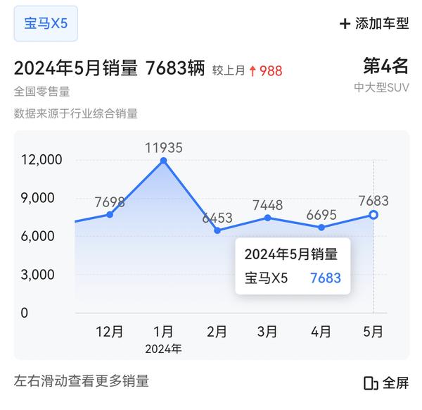 wan 发表于 2024-06-14 13:23 小幅波动肯定有,但有大的下降很难。X5的客户群体很稳定。 2024年1--5月,X5总共卖出了40,214辆,平均每个月销量:8,042辆。2023年全年卖出了:94,895辆,平均每个月:7,907辆。 今年1-5月的平均月销量和去年平均月销量保持稳定。还略增。 |