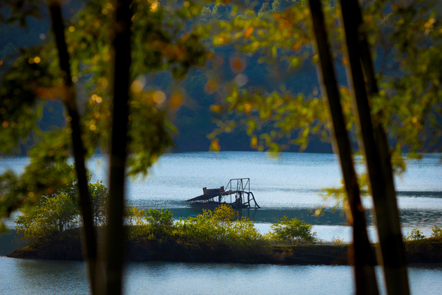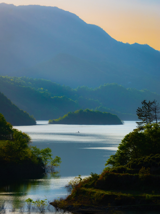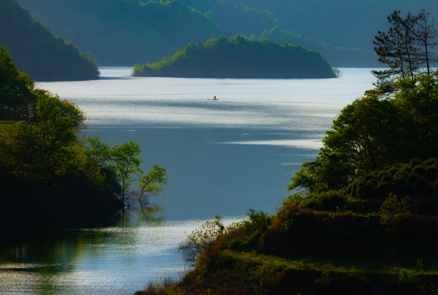 茫茫群山,碧水孤舟,大小对比,诗情画意