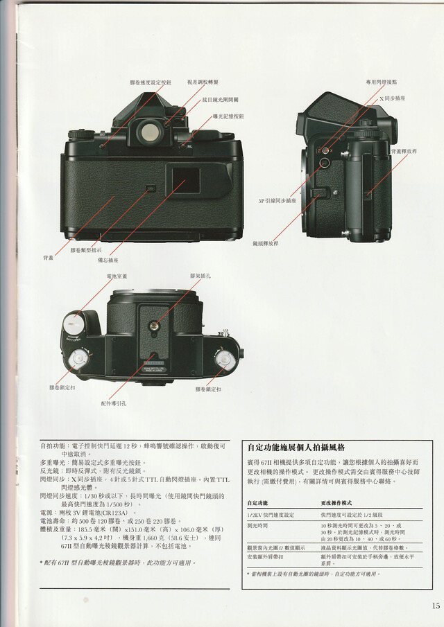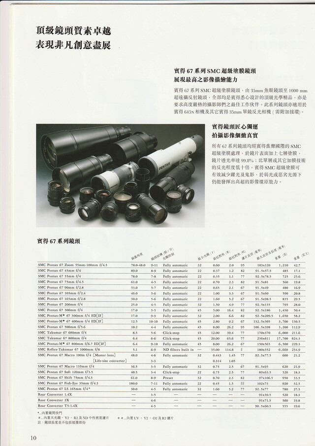《Pentax 67II》画册,1999,全16页相比数码新相机越来越重(A1二代、Z6三代对比前代),宾得67二代虽然只比一代轻了90克(减重不足6%),实在难能可贵。虽然镜头更新乏善可陈,十年过去只新推出了Zoom 55-100 f/4.5,Soft 120 f/3.5和100 f/4 微距,但是另有三支新镜头75 f/2.8,Zoom 90-180 f/5.6和300 f/4 ED(IF)在机身之后推出的,1999年的画册看不到介绍。