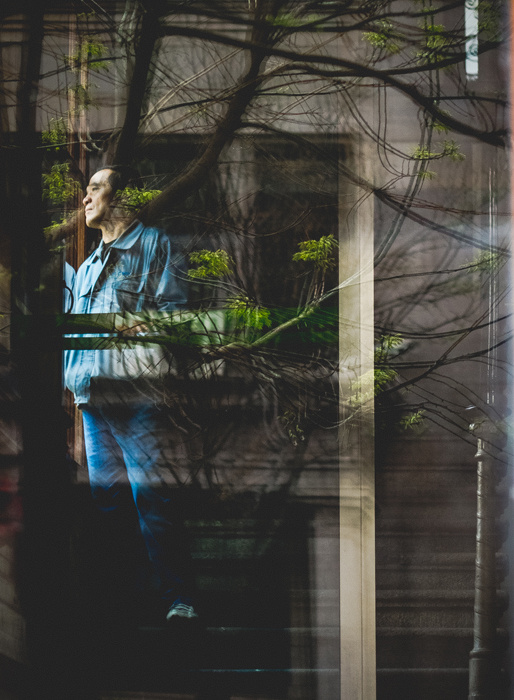 一个中年男人的千愁万绪。隔着木门的玻璃拍一栋老洋房里面的中年男人。房子对面的树映在玻璃上。