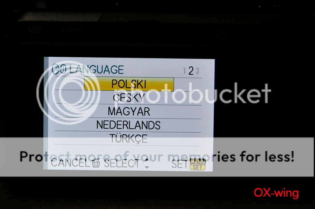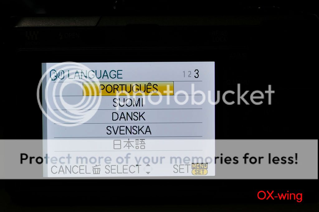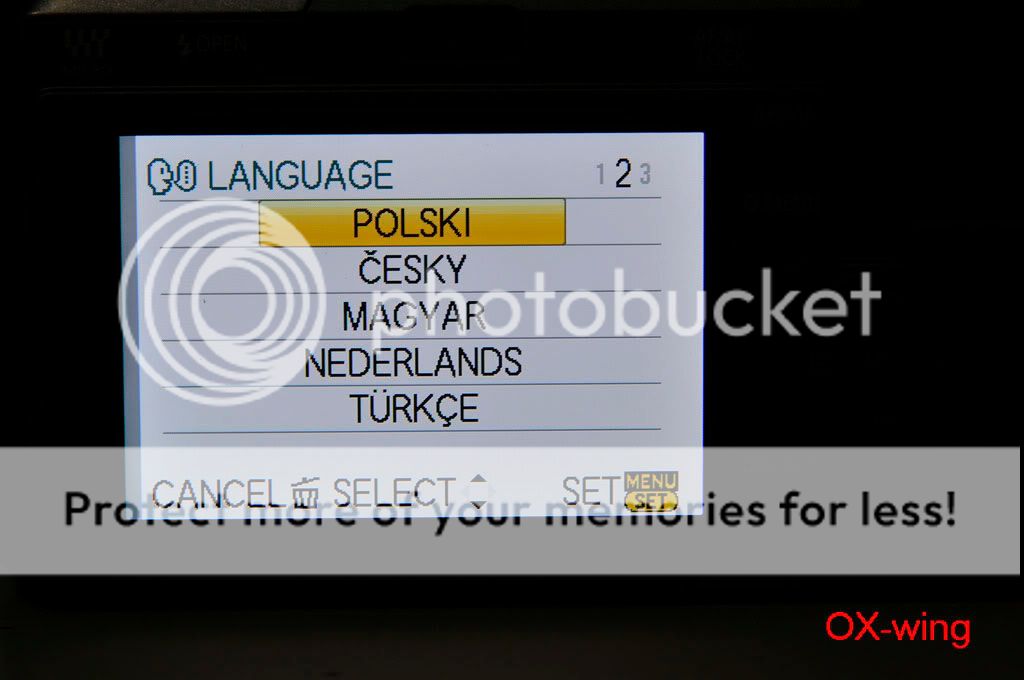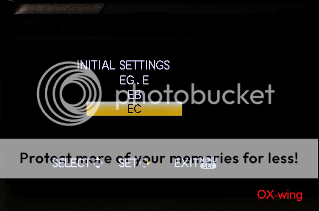 /sorthread.php?threadid=682430&pagenumber=1 按照“老程序員”的方法: 1、电源开关处于“OFF”,模式转盘置于“P”档,驱动模式杆置于“单拍”; 2、同时按住“AF/AE LOCK”按钮和“DISPLAY”按钮,用手指将电源开关从“OFF”推向“ON”----开机; 3、按一下“PLAYBACK”按钮; 4、同时按住“AF/AE LOCK”按钮和“ISO”(^方向)按钮,用手指将电源开关从“ON”推向“OFF”----关机,这时LCD上显示一个三角形包围感叹号“!”; 5、电源开关从“OFF”推向“ON”----开机; 6、同时按住“MENU/SET”按钮和“WB”(>方向)按钮,用手指将电源开关从“ON”推向“OFF”----关机;这时LCD上显示“Initial Settings”;应该能够看到语言选择;一般“GT”是繁体中文,“GK”是简体中文,“PP”是英语; 7、按照LCD提示输入,“WB”(>方向)按钮,然后自动关机; 8、重新开机,屏幕上显示要求重新设定时间,应该菜单语言改过来了。 --------------------------------- 剛剛試了,機器是托人在香港買的,但是卻買到歐洲版,只有英文、發文、德文、日文等。 我的女友進入工程模式之後出現EG.E 、EB(這個是默認)、EC這三種選擇。 EG.E 和 EC是完全一樣~~~ 但是語言增加到三頁15樣,全是拉丁文。 所以最後還是改回EB算了~ 只有6樣,比較簡潔一點,因為都是用英文啦。 以下是過程~ 1.原來默認的菜單 ![]() 2.第二頁~ 總共只有六個語言 ![]() 3.黃色感嘆號(第四步) ![]() 4.工程模式~ 三種都是EG(English 嗎?)開頭~ 呵呵 ![]() 5.選了第一個EG.E ![]() 6.EG.E 第一頁~ ![]() 7.第二頁 ![]() 8.第三頁 ![]() 9。重設時間、拔電池~ 再次進入工程模式 ![]() 10~ 這次選EC(還以為帶個C 就有CHinese,太傻太天真) ![]() 11.Ok ![]() 12~EC第一頁 ![]() 13.第二頁 ![]() 14.第三頁~ 跟前面的EG.E 一樣!沒有仔細研究其他~ IMG]http://i560.photobucket.com/albums/ss46/oxwing2/My%20Gears/GF1/_MSP3807.jpg[/IMG] 15~ 還是用回EB好了~ 比較簡潔,看到雞腸就煩~ ![]() 16~ End ![]() 實驗結果~ 可以多次進入工程模式,只要每次都重設一下時間、日期。 然後拔出電池等一會再放回去就可以! 由於在美國只能買到歐美版,所以也是沒有中文~ 聽說V1.1之後進入了工程模式就每次關機都出現那個黃色感嘆號。大家還是後果自負好了! 呵呵 |