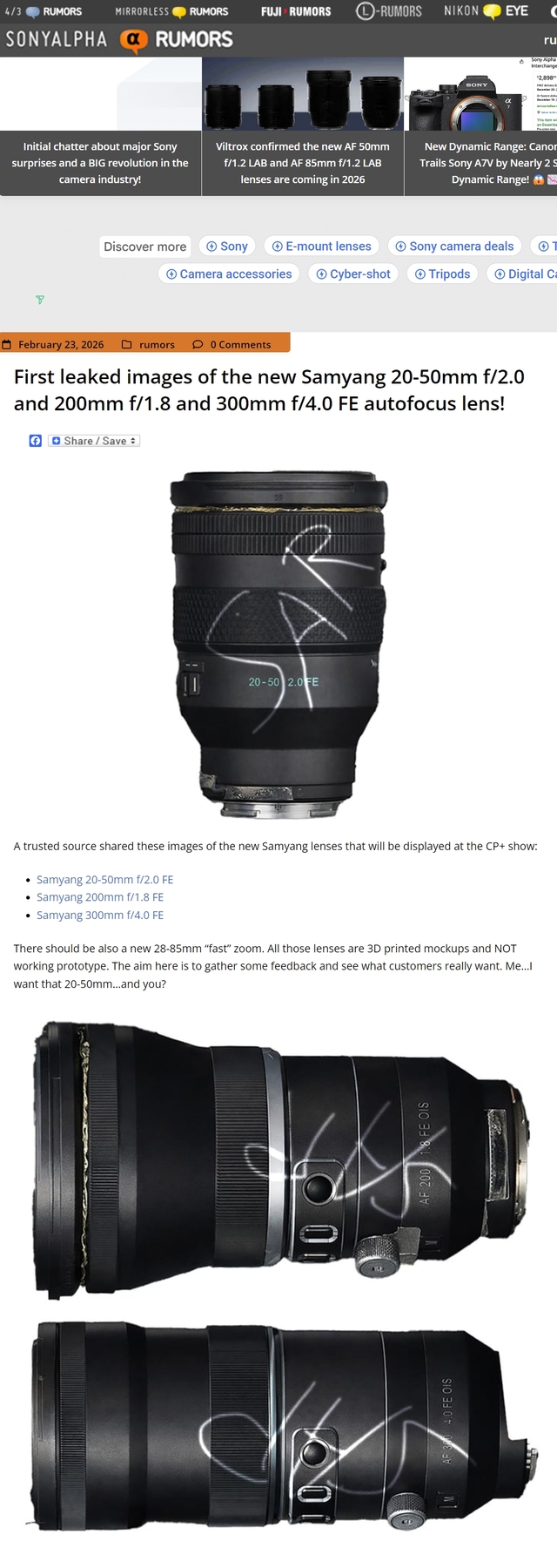 入魔说Samyang将推出索尼E口的200mm F1.8和300mm F4.0等三只自动对焦镜头!