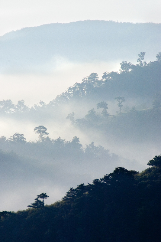 赶到拍摄点不久,云雾渐低远山终于露出了尖尖角,微微的晨曦也透过云雾展现了出来