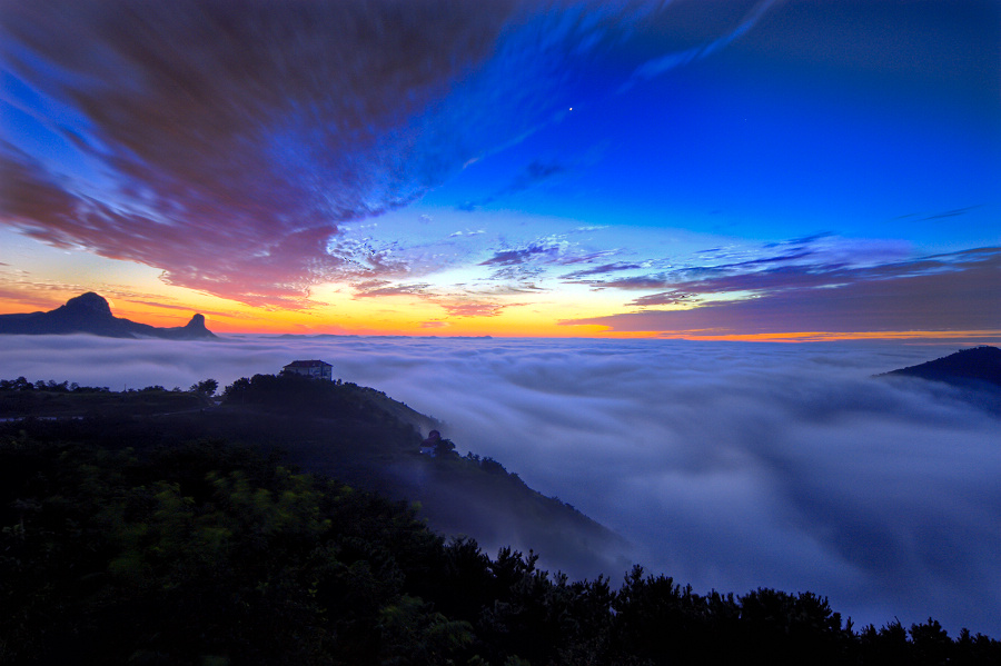 七星台海拔只有600米高,出现云海奇观尤为难得,今年8月底一次凄风冷雨过后,预计到可能会有好天气,于是一行三人商量着去拍一拍朝霞。头天晚上大雾中赶到七星台住在农家旅馆,第二天早上四点半起床准备拍摄,哪知屋外大雾弥漫,十米外不见人,十分失望。这时我偶尔抬头看了看天,发现居然隐约能看到天上的星星,于是猛然醒悟:这层云雾也就比我们高几米,在那之上就是云海奇观!于是兴冲冲的赶到拍摄点耐心等待,果然不久之后云雾渐低,我们置身云雾之上,见到一次难得的云雾翻腾的云海奇观